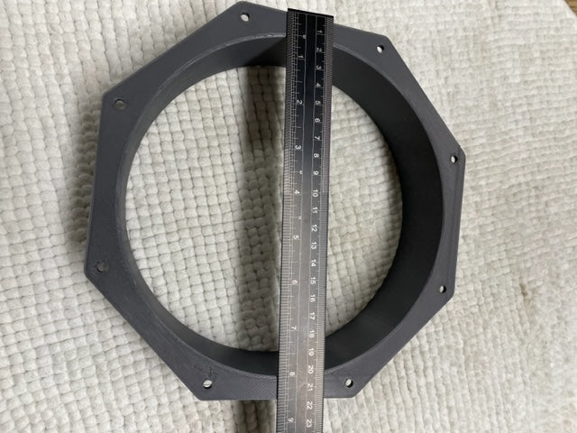 The 8 inch adapter has an 8-1/2" octagon diameter base, the hose flange is 7-3/4 inch round to slip the hose over.