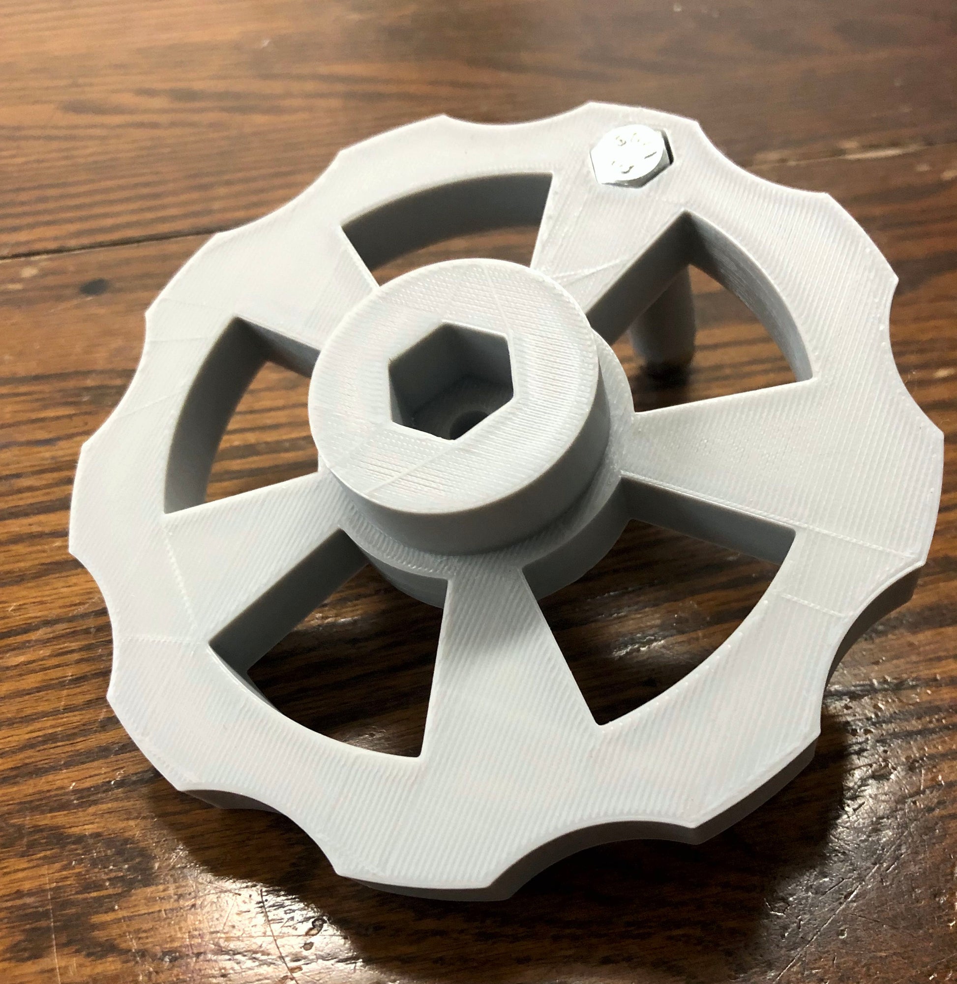 These are made on a 3D printer and are on the Radial Arm Saw they were fit and tested on. The shaft diameter again is 5/8" Hex like a bolt head. You will need to use the washer and screw that came with your saw to mount to arbor. The spinner and hardware for the wheel is a 1/4 x 1-1/2" bolt, Nylock nut and "T" handle wrench (to install the Nylock nut in the recess of the spinner) all are included.