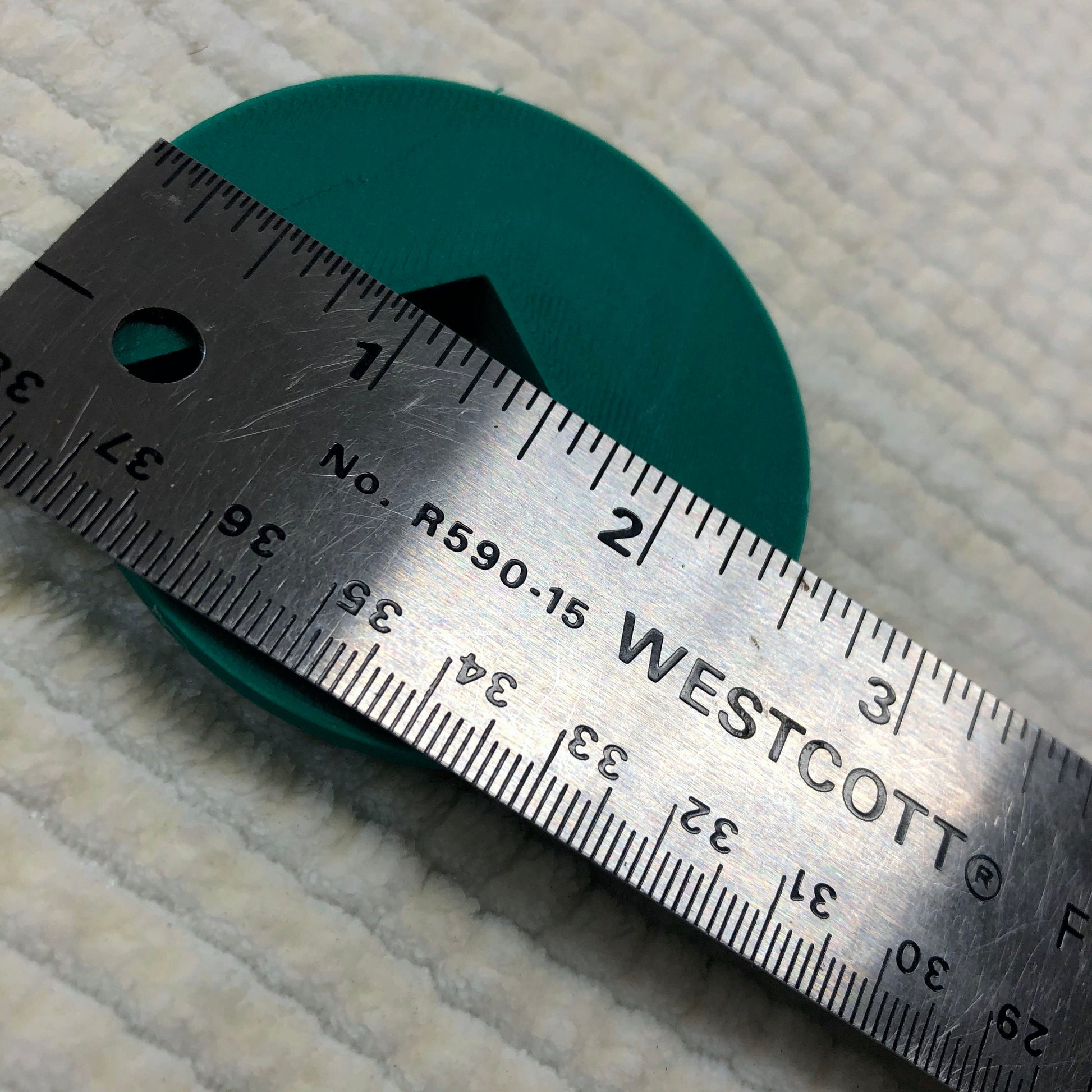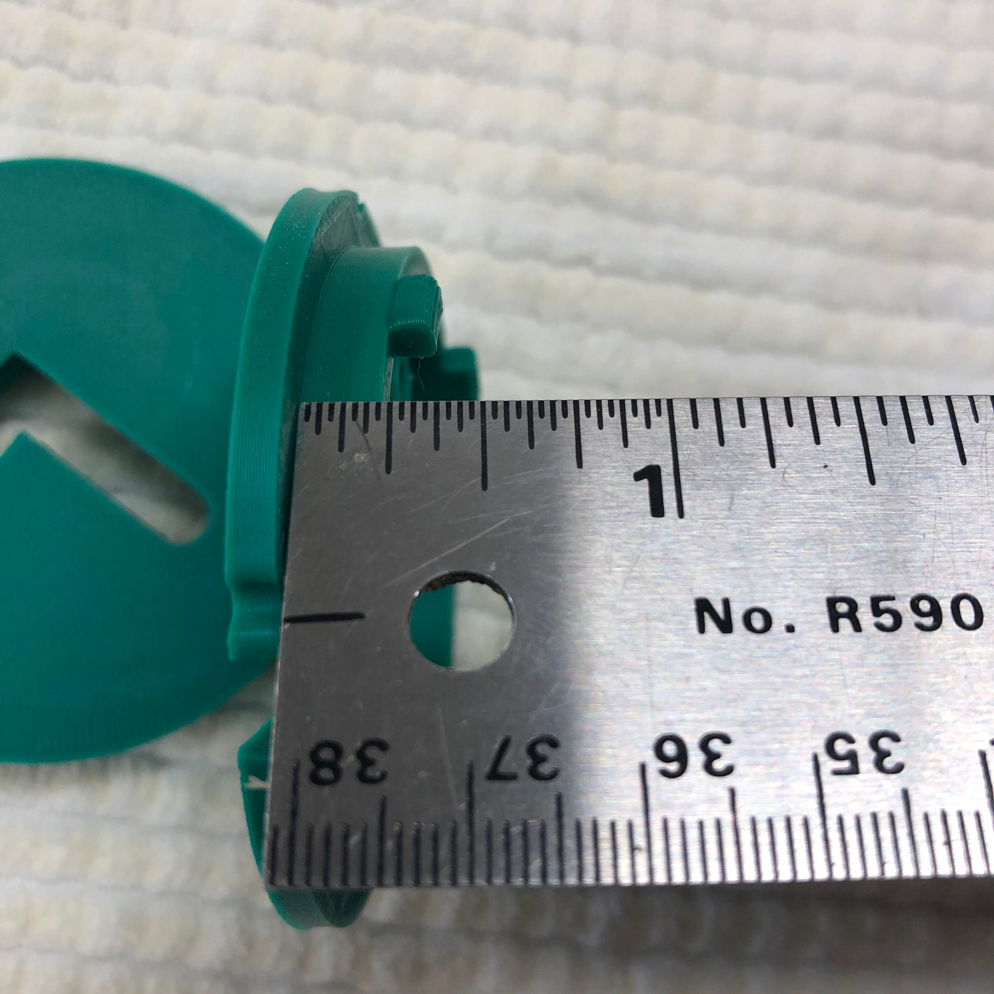 These are Scroll Saw Mount Inserts the blade passes through. They have been 3D printed. The outer diameter is 2.498 inches or 63.5 mm diameter at the top. Inside diameter is 2.119 inches or 53.5mm. The top flange thickness is (1/8) 0.125 inches or 3.0 mm, the second supporting ribs are 3.0 mm. The insert was made to replace an insert for a Woodtek 26 in Scroll Saw. These inserts are new and have been tested for fit on the model saw.