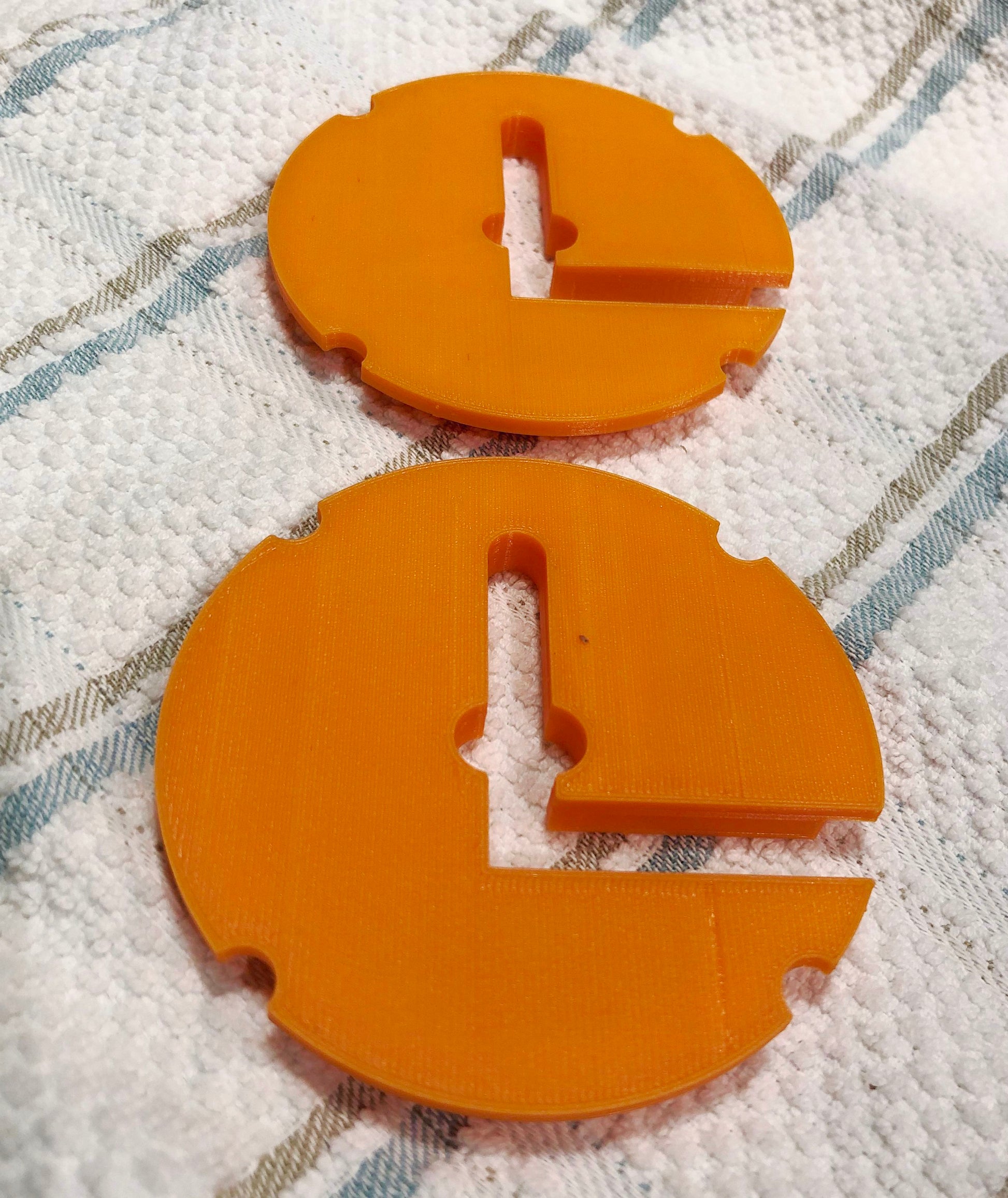 These are Scroll Saw Mount Inserts the blade passes through. They have been 3D printed and fit any saw with the same width as the 3.174 inch or 80 mm diameter at the top. These were made for my Ryobi 16 in scroll saw to replace the one that came with the saw. It was a used saw and the previous owner had nicked up the insert as you can see in the photos. The black insert was the 1st try at printing and replacing the insert.