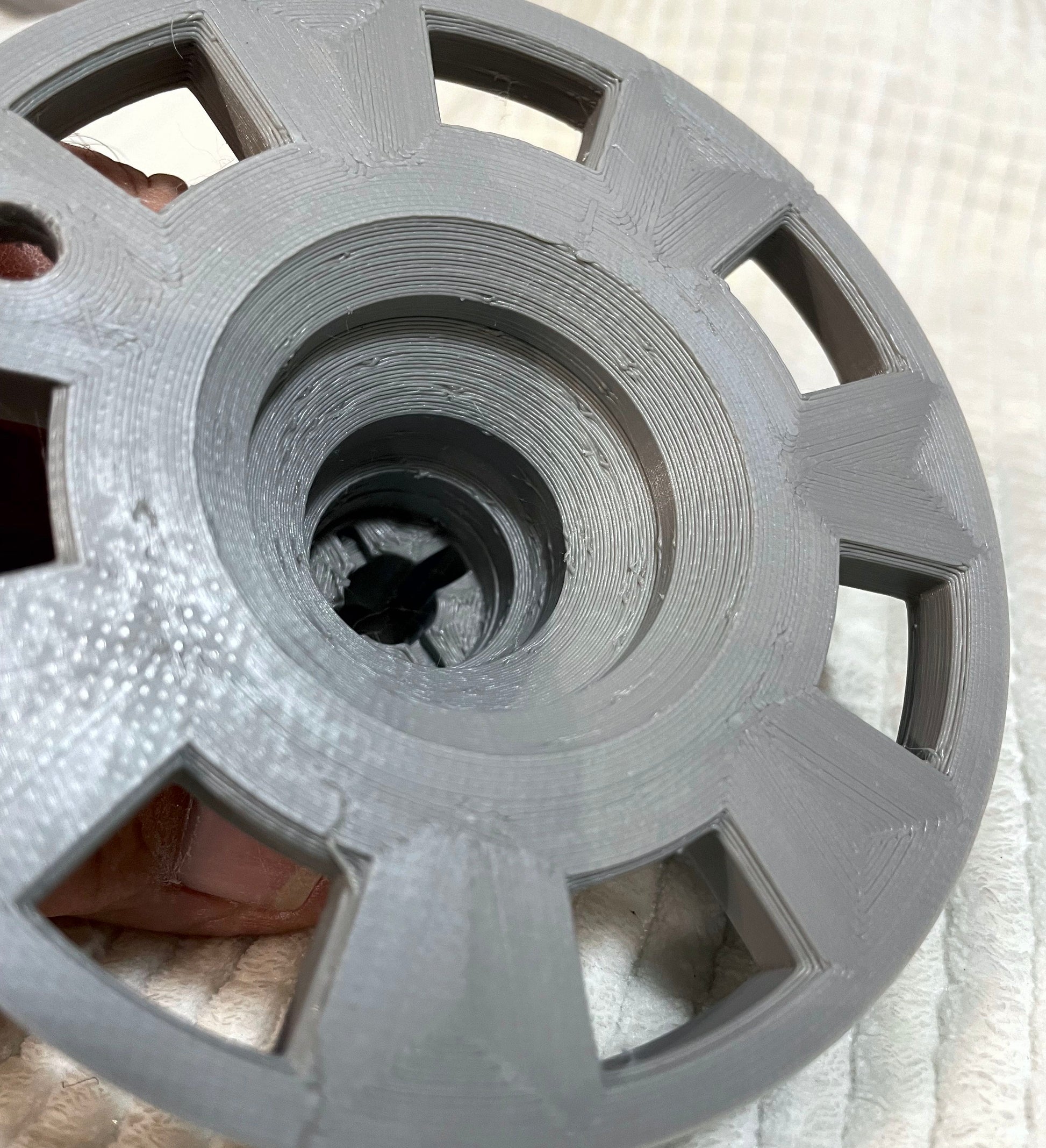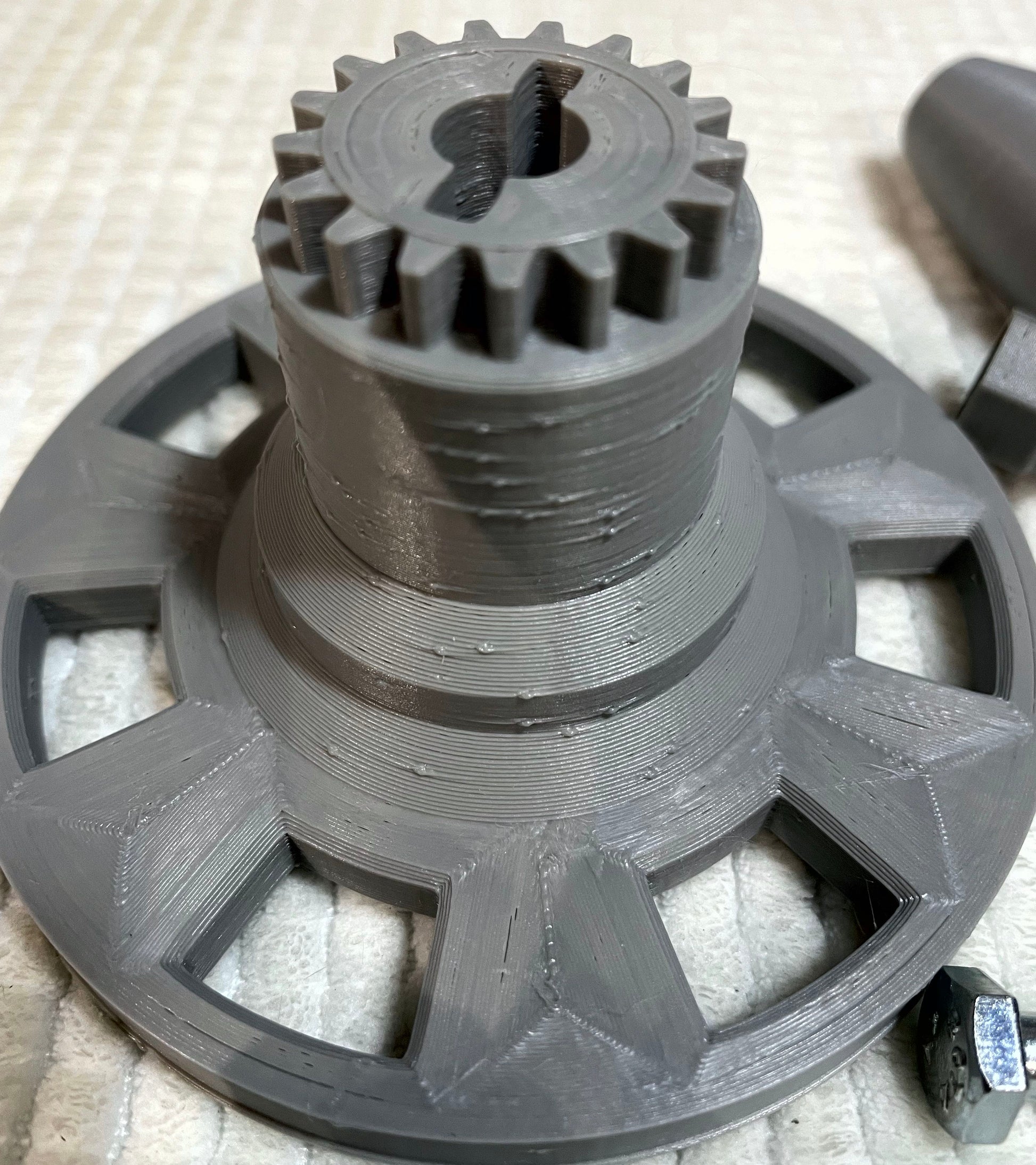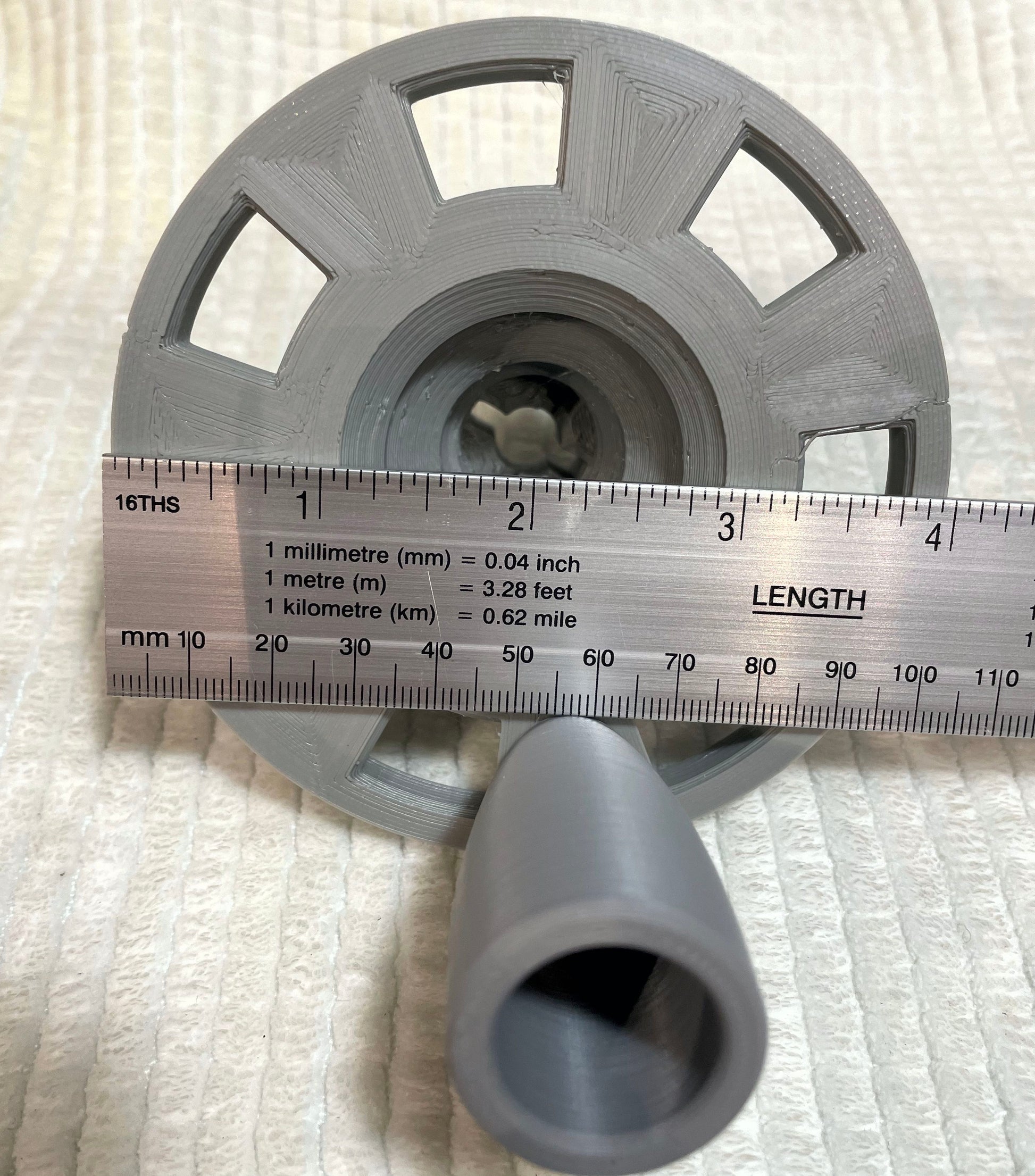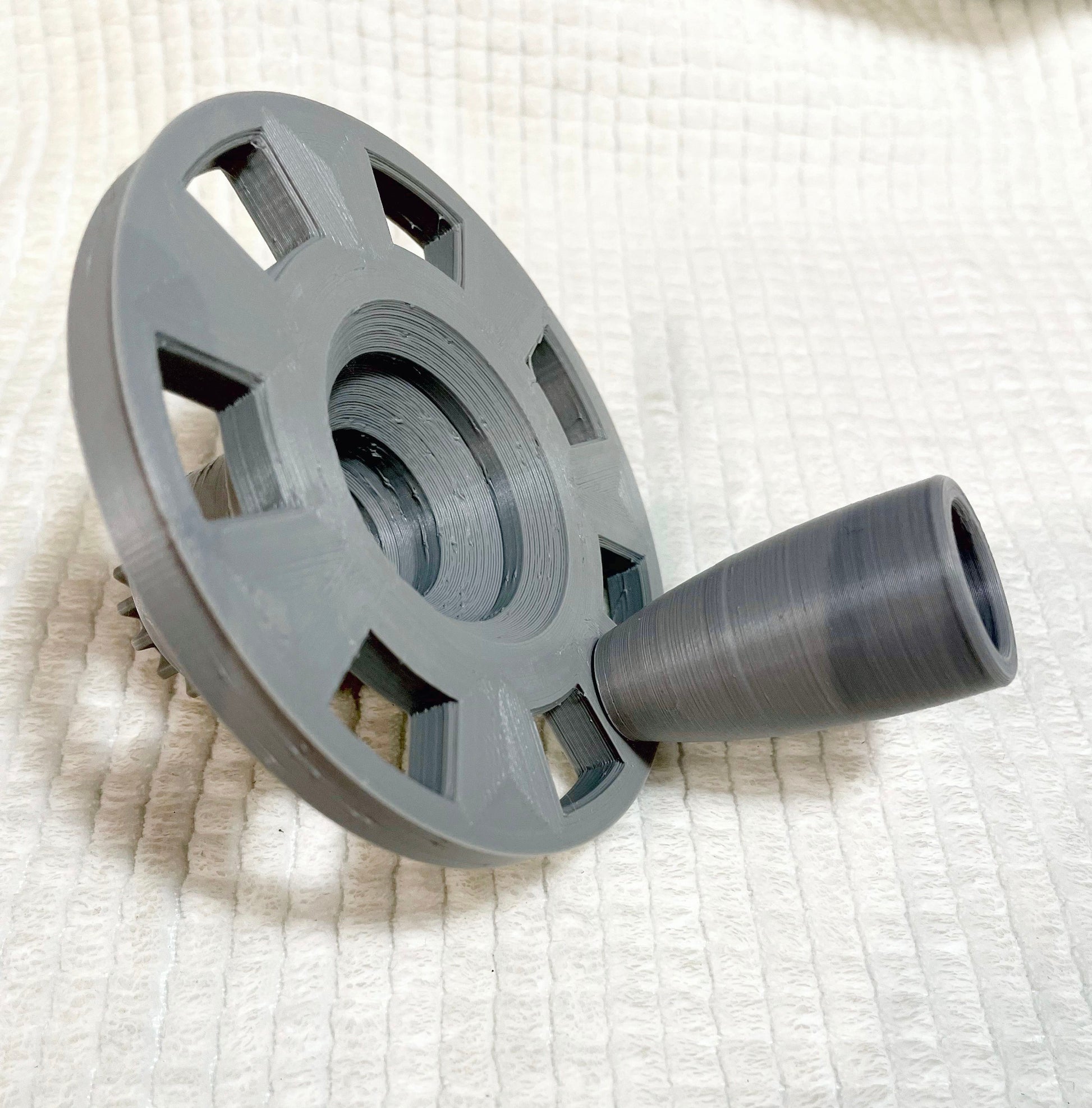 We were asked to make one for a customer and he sent the original hand wheel that is black in the photos. The part has been fit tested and will replace the original part. The diameter is 4.0 in, the height is 2 inches without the hand grip spinner. The hand spinner is 2 inches in length and makes the total 4 inches height.
