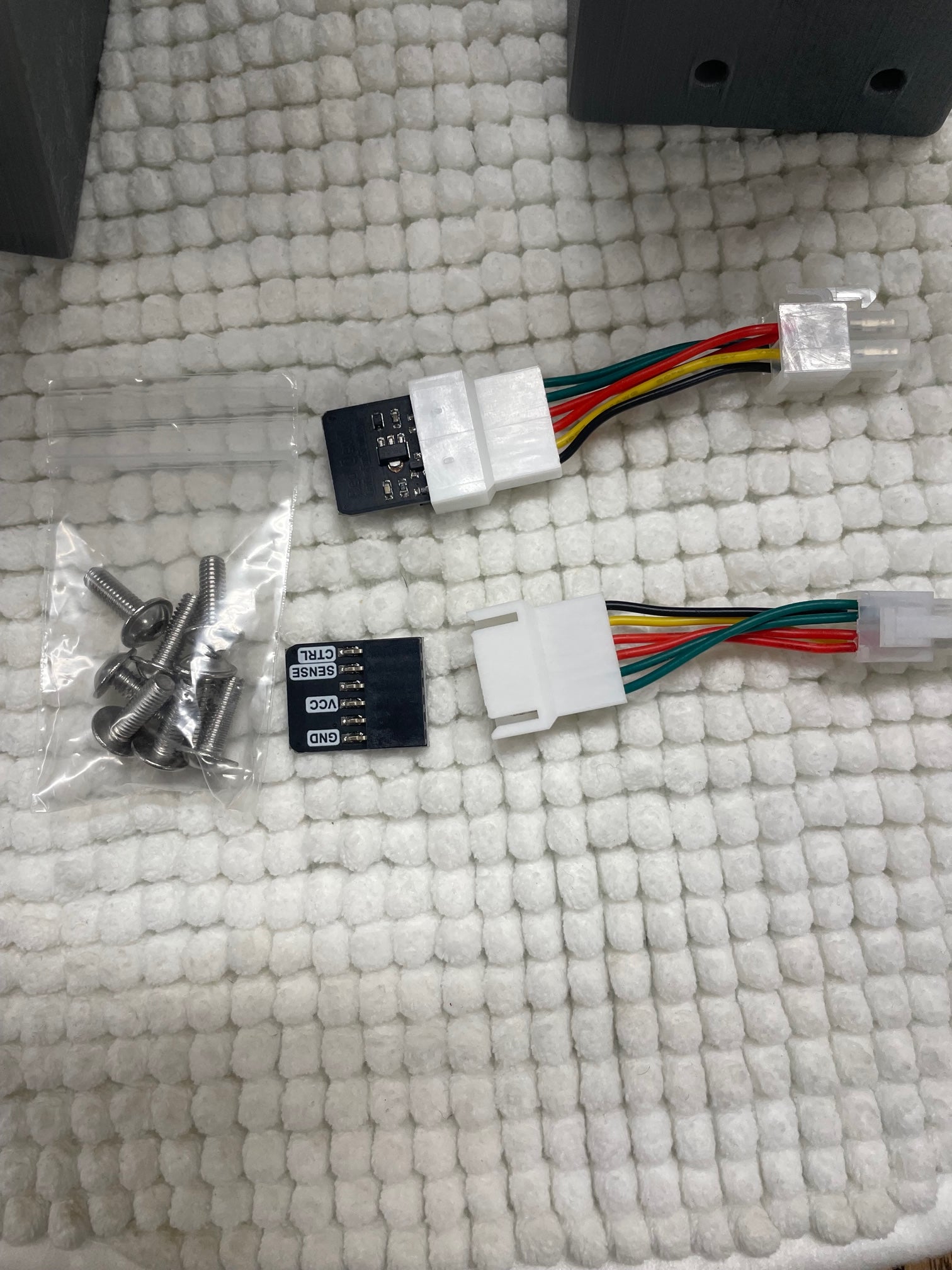 - Two - 4 Pin (2 x 2) x 6 pin (Inline) Fan Adaptors & Two 6 Pin Fan Emulators (Plugs in where the original fans did)