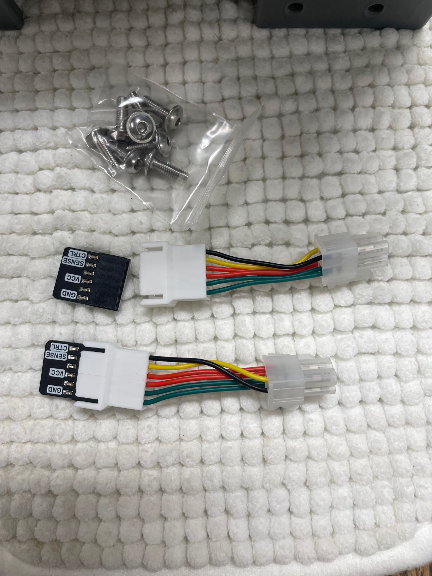 - Two - 4 Pin (2 x 2) x 6 pin (Inline) Fan Adaptors & Two 6 Pin Fan Emulators (Plugs in where the original fans did)